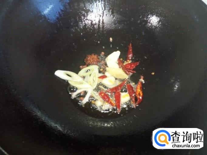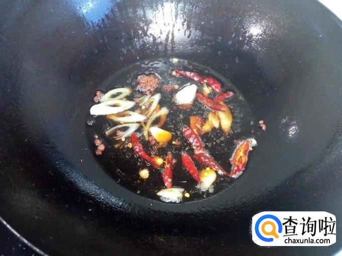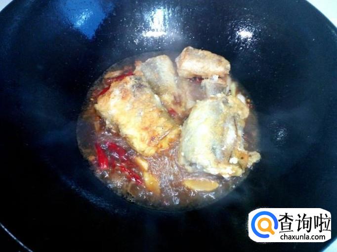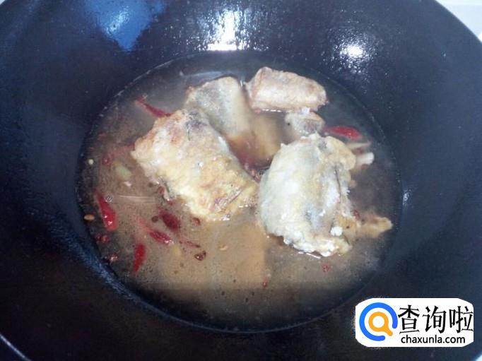 盛出煎塌鱼多余的油,锅里留底油。放入花椒,八角,葱,姜,蒜,红干椒爆锅。放入调和好的料汁烧开。