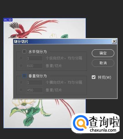 分别勾选“水平划分为”与“垂直划分为”;再在对应的框内分别输入数字3;再点确定。那么,这张大图即被分为9块。