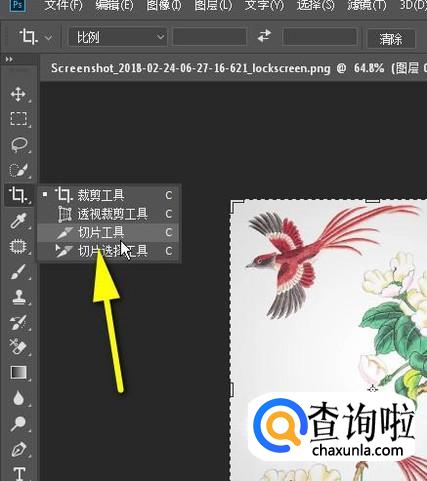 鼠标移到画布左侧的工具栏这里,长点住裁剪工具,从中选择:切片工具。