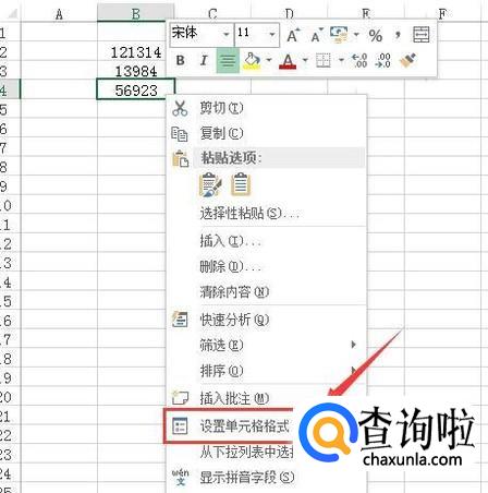 打开excel在单元格内输入一些数据,然后选择一个单元格内的数据,单击鼠标右键在右键菜单哪里找到设置单元格格式选项,如图所示: