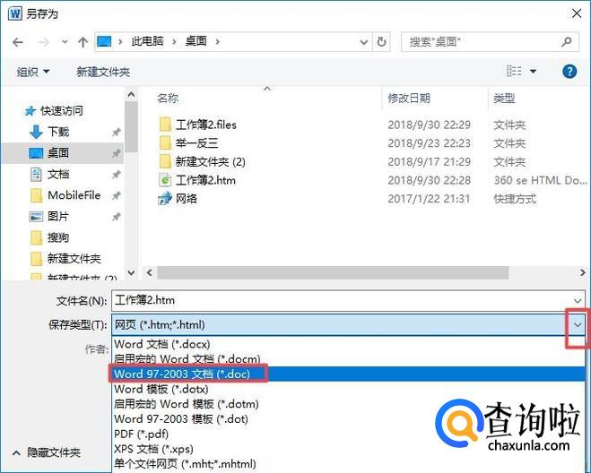 然后我们点击保存类型边上的下拉箭头,弹出的界面,我们点击word;