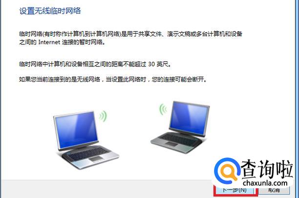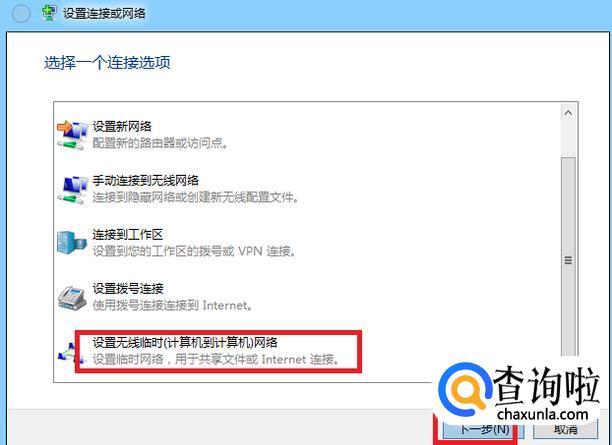 在弹出的窗口中下拉找到"设置临时网络“选项,选择后点击”下一步“。
