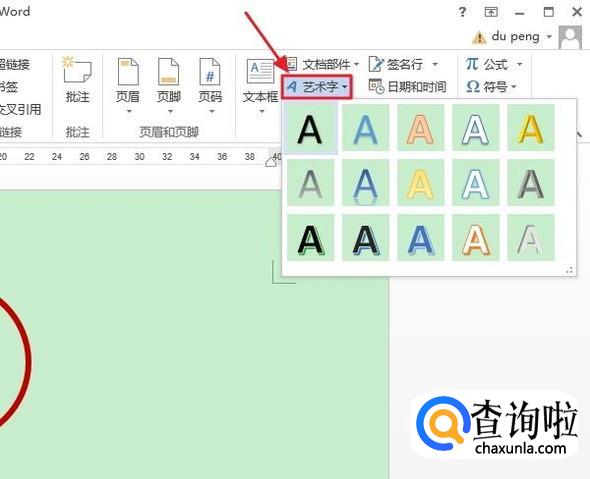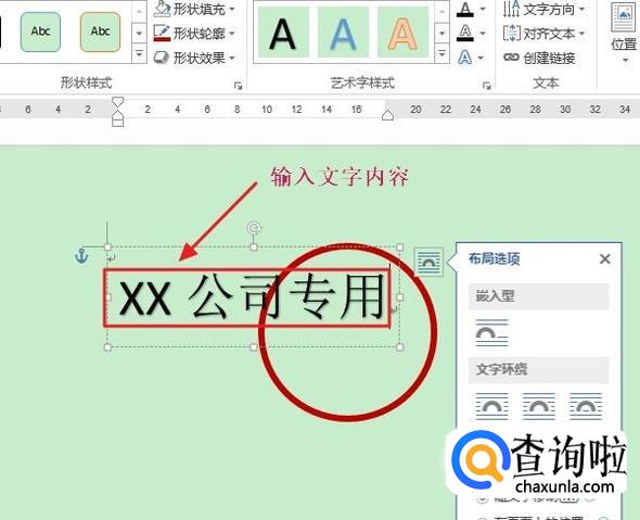 接着我们就需要输入印章里面的文字内容了,点击插入下的“艺术字”,然后在提示的地方输入文字内容;