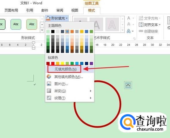 不过此时我们会发现,正圆的背景依旧还是刚才的蓝色背景,我们点击选中圆形,然后在格式里找到“形状填充”,将其设置为“无颜色填充”,效果如图二;