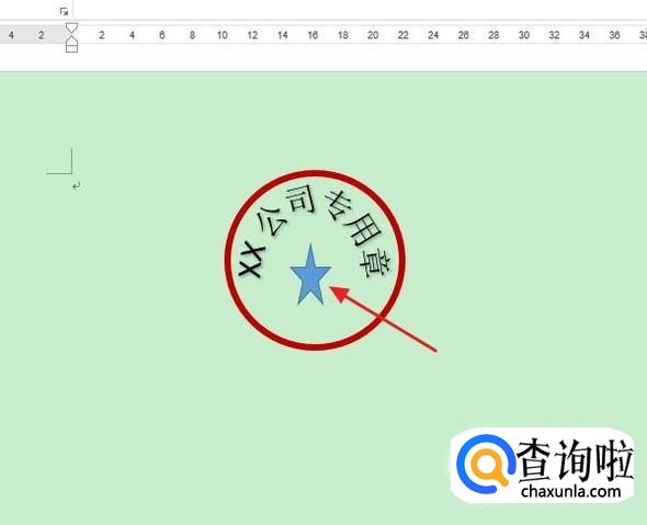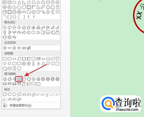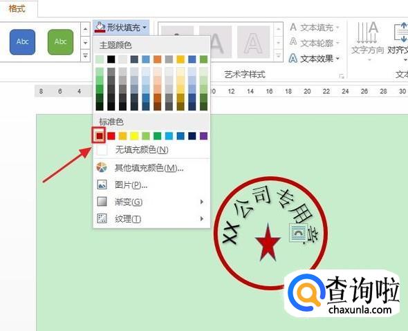 最后一步,我们"插入"-“形状”,然后找到印章正中间位置的五角星,同样的方法将其拖动到印章里面,点击五角星在填充颜色里将其填充为红色,这样就制作完成了;