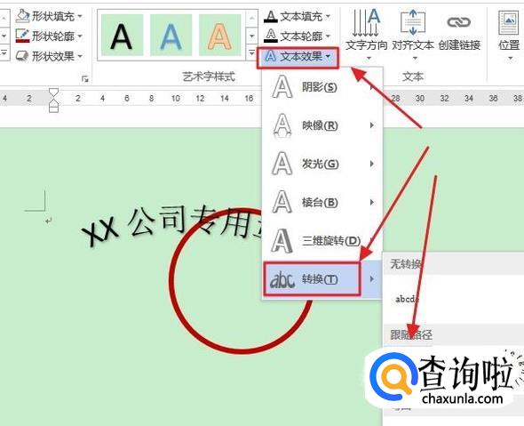 然后同样选中这部分文字,在格式里点击“文本效果”-“转换”,然后将效果设置成上弯弧的形状,如图一所示;根据字体以及圆形的大小,我们将文字拖动到合适的位置