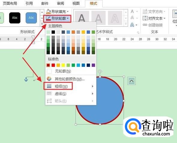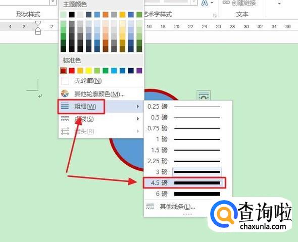 然后在格式下的“形状轮廓”里,我们给正圆的轮廓设置一个电子印章统一的红色轮廓,并且将轮廓的粗细设置为常规的4.5磅即可,如图所示;