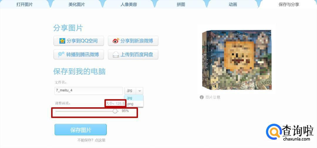 在这个界面里,你可以选择要把图片保存为jpg还是png都可以。另外仅仅将画质改为95%图片就已经可以压缩到125.5k了,是不是很方便,如果你想要更大或更小的尺寸自己调整就好啦。