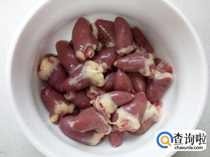 鸡心用水清洗干净,控干水分。用刀把鸡心分成四半(中间一刀,在两半的鸡心上再切一刀),去除上面的血块,血管。