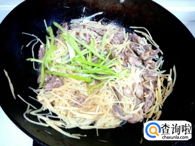 鸡心,鸡胗,略翻炒一下就可以,然后放入土豆丝,放入少许醋,盐,大火快速翻炒。