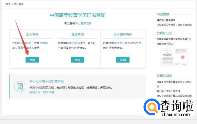 进入中国高等教育学历证书查询界面,然后选择本人查询,点击查询