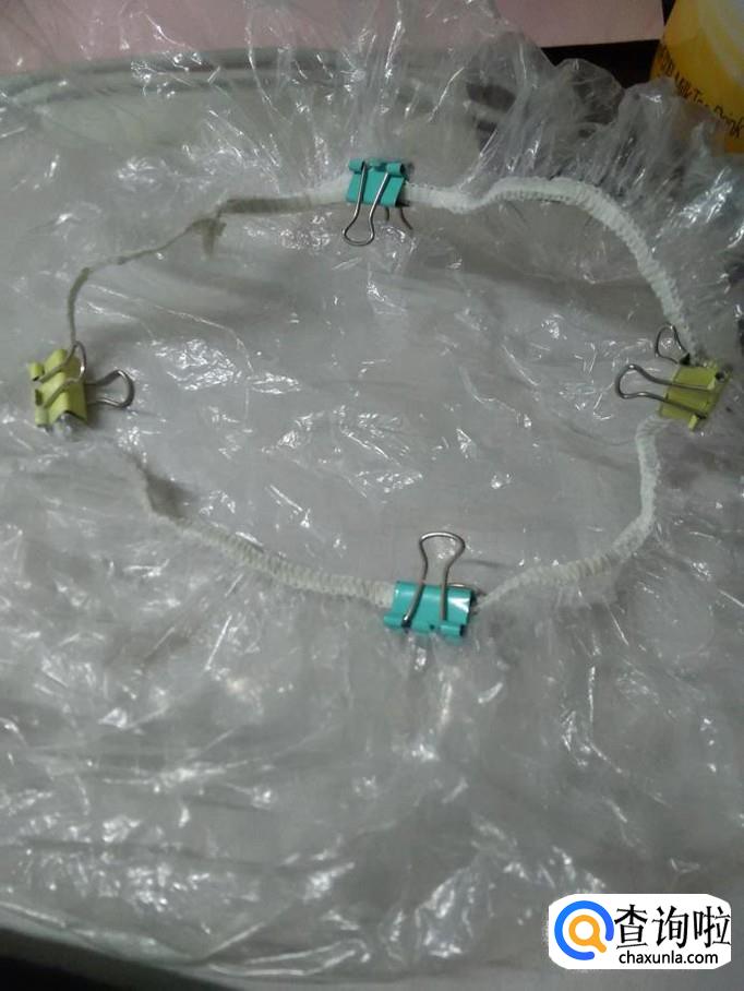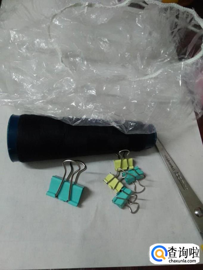 准备一个浴帽、四个小夹子,一个大夹子,一轴线,一把剪刀。