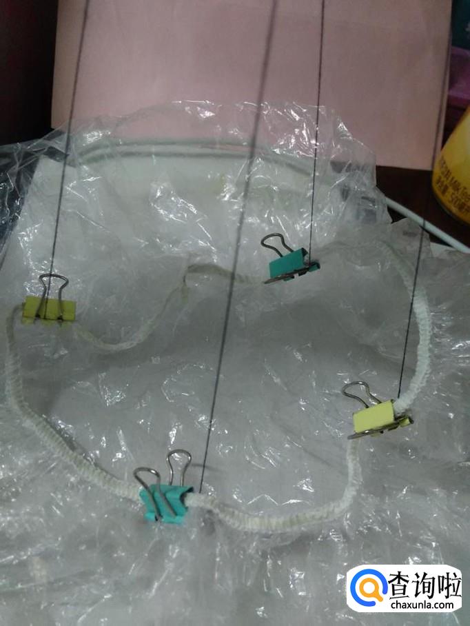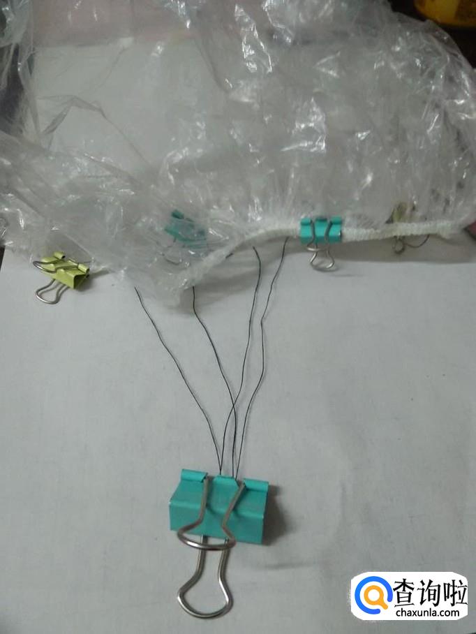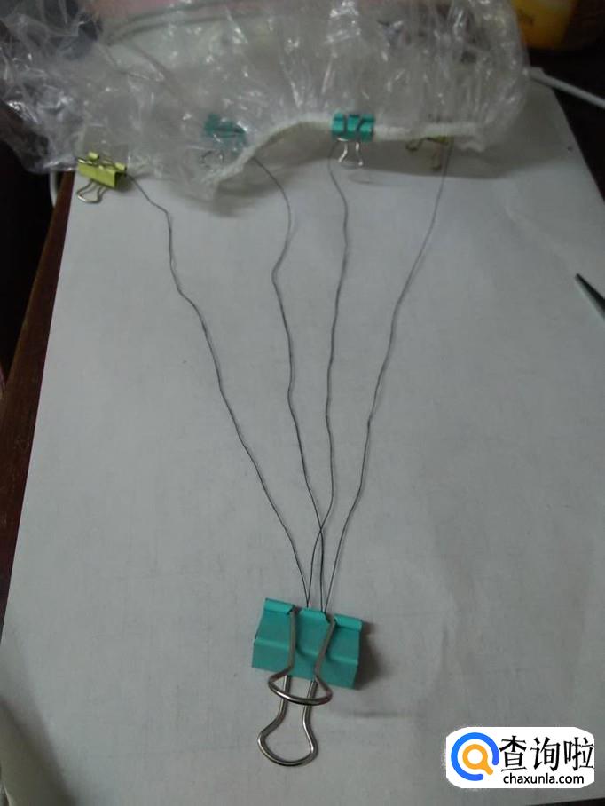 把两条线交叉的地方夹在大夹子里面,降落伞就做好了,当把降落伞扔向空中的时候,大夹子会带着上方的浴帽慢慢降落到地面上,特别好玩。