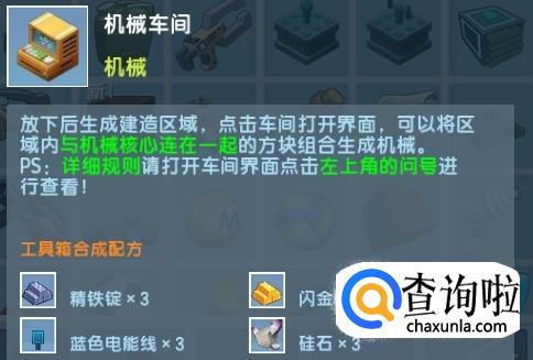 首先,我们制作一个机械车间,机械车间的配方是精铁锭X3、闪金锭X3、蓝色电能线X3、硅石X3。