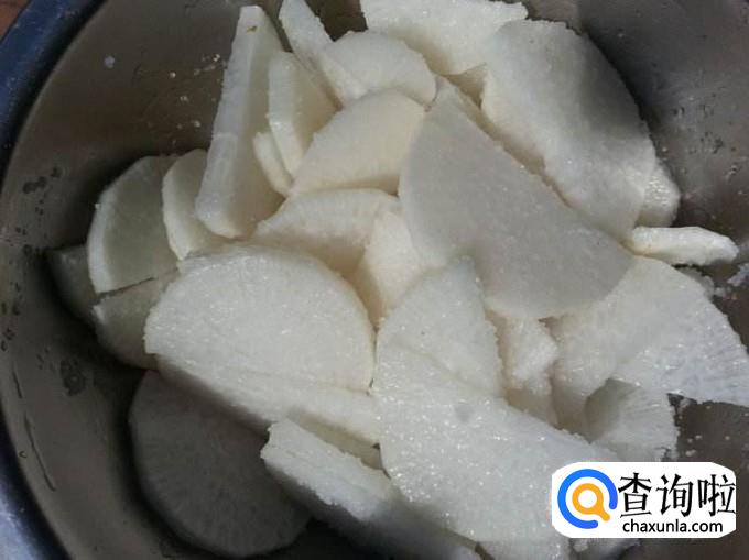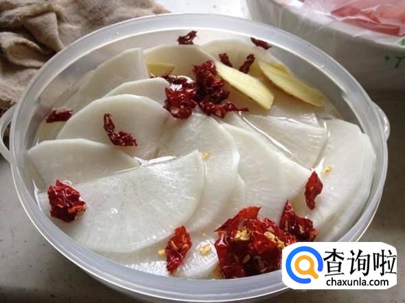 把姜切成薄片,干辣椒切成段,放入萝卜片中,然后放入少许水,加入适量糖、醋、盐腌制2小时。