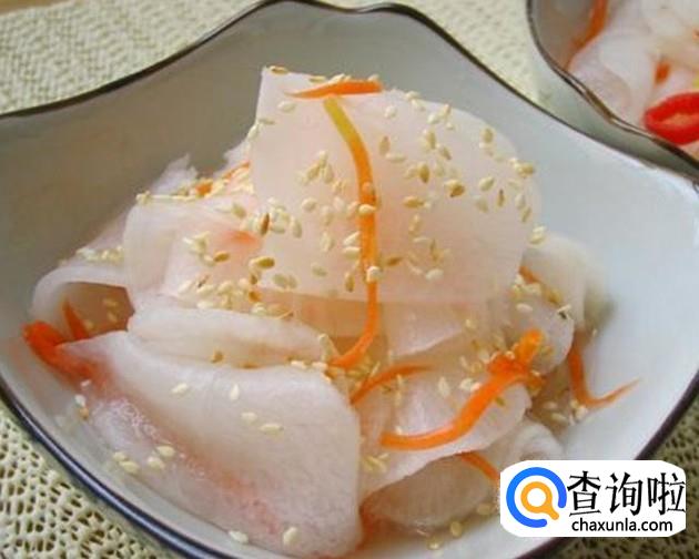 2小时候,将萝卜片捞出放入盘中,然后放上胡萝卜丝和熟芝麻就可以上桌了。