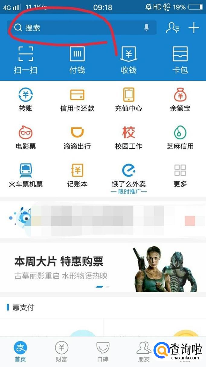 打开支付宝后,首先点击搜索。