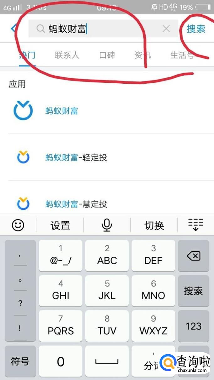 输入蚂蚁财富,点击搜索。