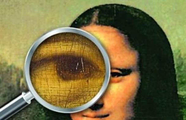 意大利席西尔瓦诺·温切蒂借助显微镜观察油画中蒙娜丽莎的眼睛,发现微小字符。她绿褐色的右眼球上有LV字样,很明显这是达芬奇的姓名首字母。而左眼也被发现有奇怪的数字和字母,有专家说是字母CE或者CB和数字2,意义是什么暂时没有人给出确切的说法。