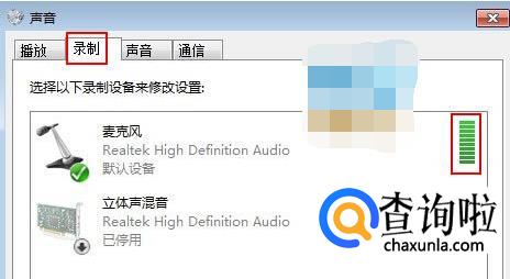 在录制标签里面,对着麦克风喊话,就能看到如下图所示的绿色条。这代表的就是音量的高低。