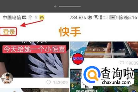 打开快手APP以后,我们首先需要点击最左上方的“登录”,然后使用自己的账户登录进去;