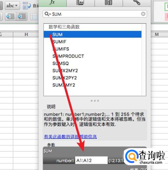在函数窗口,输入sum,然后双击这个函数,在下方的参数里输入A1:A12,表示是对这几个单元格相加求和。