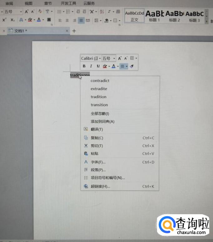 在word文档中,如果英文字母下方出现波浪红线,一般属于单词的拼写错误,文档自动标出,在此我们以“traditional"为例。