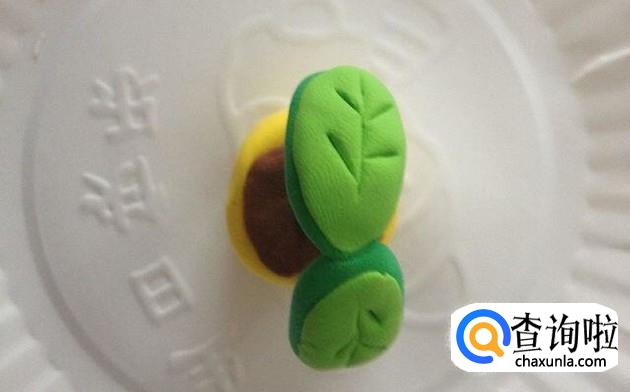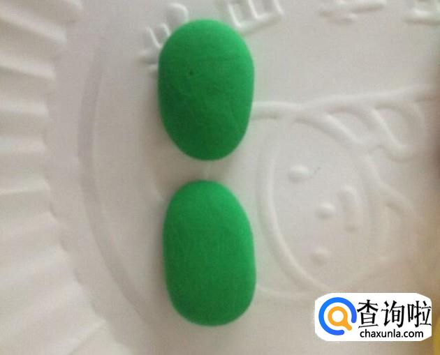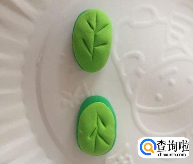 将绿色的塔积米揪成两块,捏成叶子的形状。