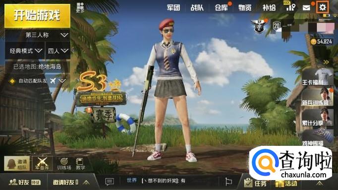 首先打开刺激战场,在主页里面打开右上角的“设置”,即名字上面的小齿轮图标。