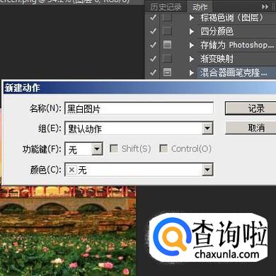 接下来,开始,把此图片制作成黑白效果。图片制作黑白效果后,再点动作面板的停止记录。那么,这个制作黑白效果的动作就录制好了。