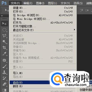再把此图片关闭。接着,再点菜单栏中顺序点:文件,自动,批处理;调出批处理界面。