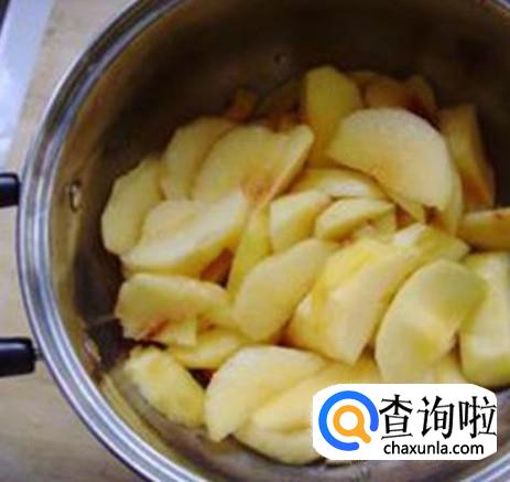 将黄桃的皮和核去掉,然后切成小块,放入锅中,如图所示。