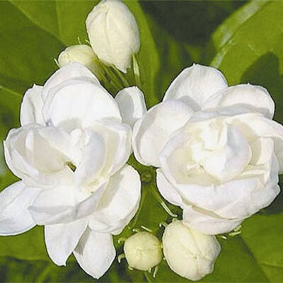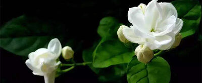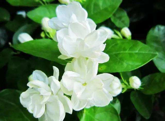茉莉花,别名:茉莉,拉丁文名:Jasminum sambac (L.) Ait,颜色白色,木犀科、素馨属直立或攀援灌木,高达3米。小枝圆柱形或稍压扁状,有时中空,疏被柔毛。叶对生,单叶,叶片纸质,圆形、椭圆形、卵状椭圆形或倒卵形,两端圆或钝,基部有时微心形,在上面稍凹入或凹起,下面凸起,细脉在两面常明显,微凸起,除下面脉腋间常具簇毛外,其余无毛;裂片长圆形至近圆形,先端圆或钝。果球形,呈紫黑色。花期5-8月,果期7-9月。茉莉的花极香,为著名的花茶原料及重要的香精原料;花、叶药用治目赤肿痛,并有止咳化痰之效。