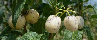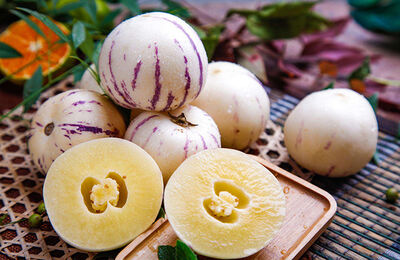 人参果(Pepino Melon)原名为香瓜茄,又名长寿果、凤果、艳果,原产南美洲,属茄科类多年生双子叶草本植物。果实成熟时果皮呈金黄色,外形似人的心脏。其果肉味道独特、脆爽多汁、是一种受欢迎的水果。果肉中含有较高的高蛋白、低脂肪、低糖等,同时富含氨基酸、维生素C和硒及钼、铜、锌、铁等十来种对人体有益的微量元素,具有保健功效。它是一种营养较为全面的蔬果两用食品,食用能补充人体所需,具有营养保健价值。