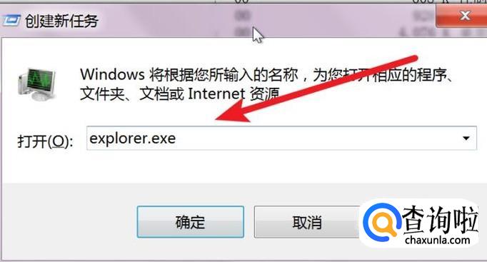 在新建任务输入框里,输入explorer.ext,点击确定按钮,这样就会重新打开这个进程,电脑的菜单栏就会重现出现了。