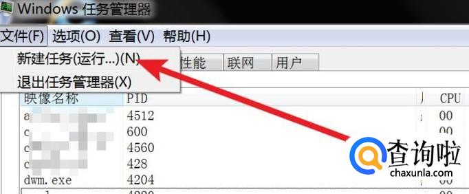 结束掉进程后,点击‘文件’菜单下的‘新建任务’。