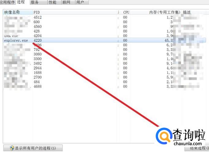 点击后,会打开任务管理器,在这里找到explorer.exe这个进程,点击下方的结束按钮。