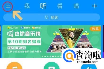 在酷狗音乐APP首界面,我们会在左上角看到一个三条线的图标,点击之后应用左侧会弹出一个窗口;