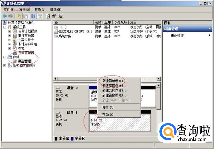如图所示,鼠标右击"磁盘 1→未分配"图标。弹出快捷菜单选项,选择"新建简单卷..."项。