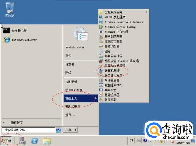 启动Windows Server 2008 R2操作系统,如图所示。点击任务栏"开始"按钮,弹出开始菜单选择"管理工具→计算机管理"项。