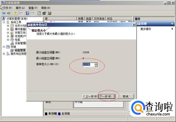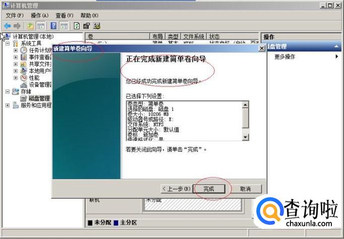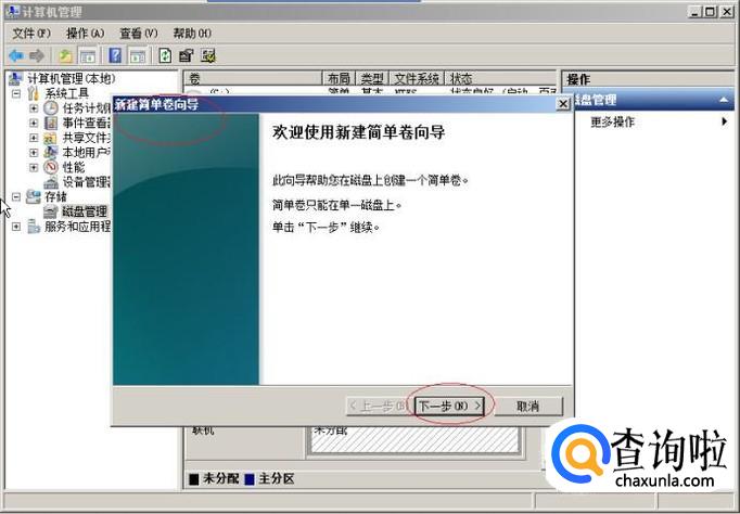 弹出"新建简单卷向导"对话框,如图所示。此向导帮助您在磁盘上创建一个简单卷,点击"下一步"按钮。
