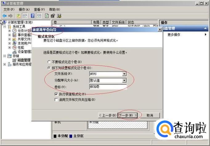 如图所示,唤出"格式化分区"选项界面。勾选"按下列设置格式化这个卷"单选框,设置完成点击"下一步"按钮。