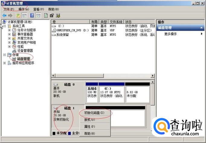 如图所示,唤出"计算机管理"程序窗口。鼠标右击"磁盘 1"图标,弹出快捷菜单选择"初始化磁盘"项。
