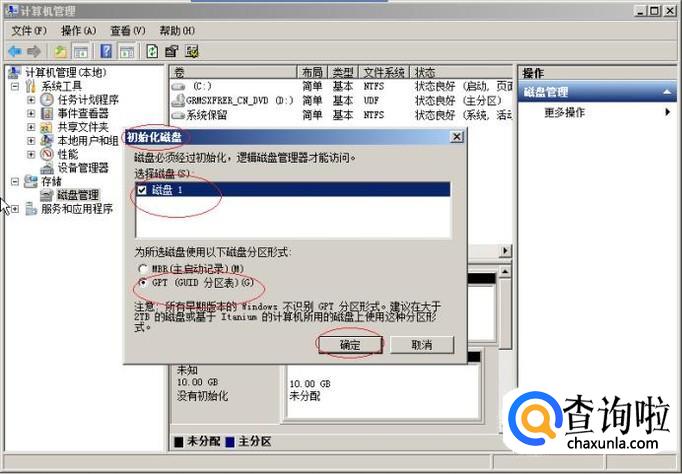 弹出"初始化磁盘"对话框,如图所示。勾选"GPT(GUID分区表)"单选框,设置完成点击"确定"按钮。