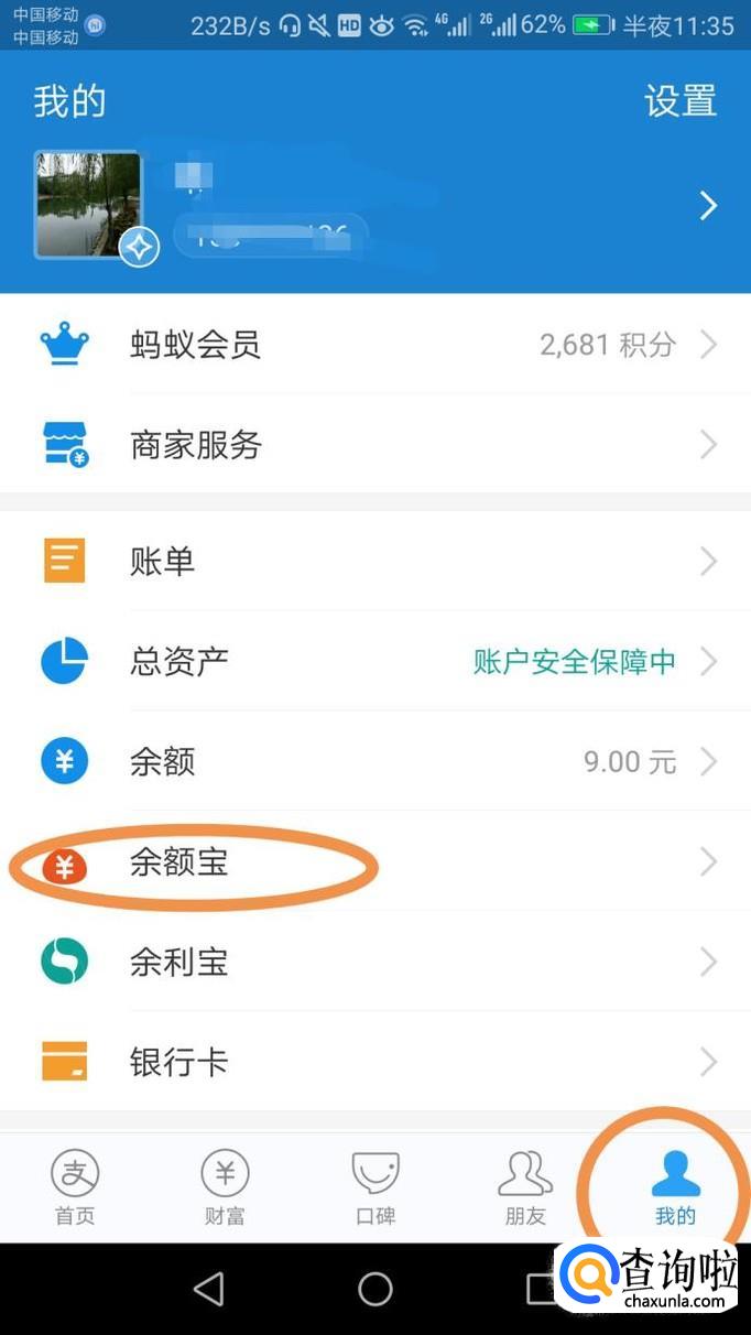 首先,打开支付宝,点击下面一栏的【我的】,再点击【余额宝】,如图所示