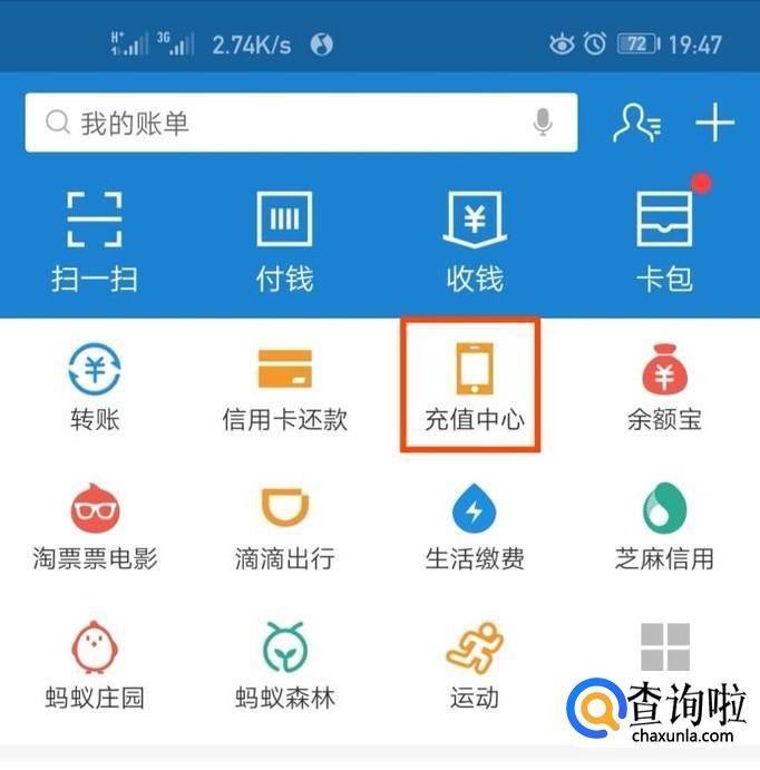 找到支付宝充值中心。