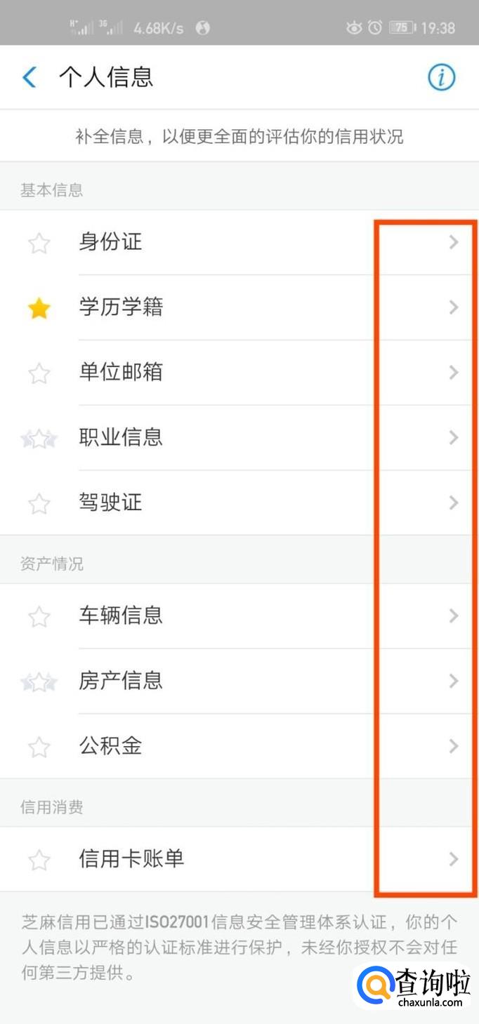 在信息管理中找到“个人信息”,然后点击进入,把自己现有的资料完善,对提升芝麻分有很大的帮助哦!