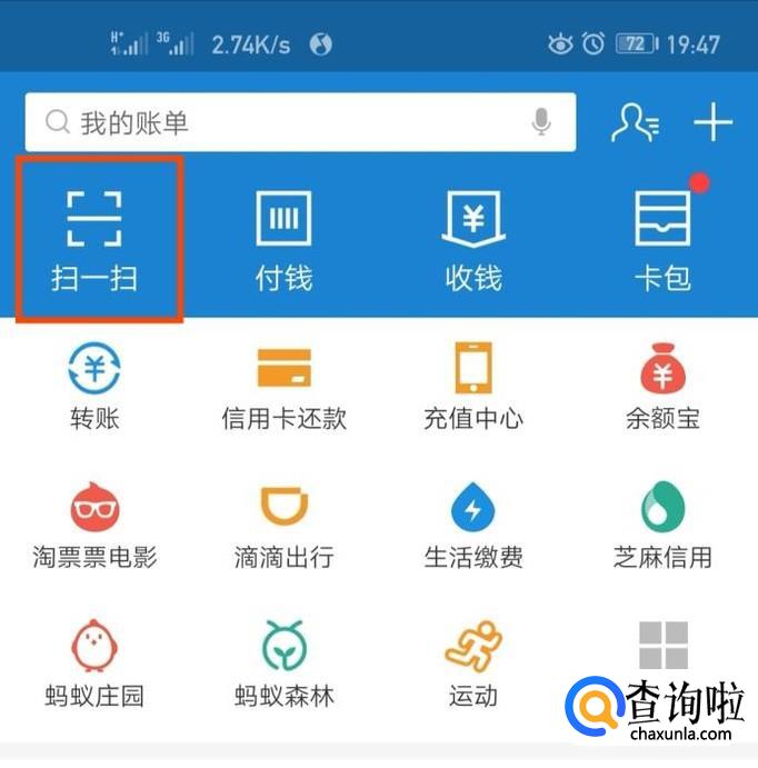 进入支付宝首页,搜索栏下面第一个功能就是“扫一扫”,点击进入,购买商品扫商家收款码支付。