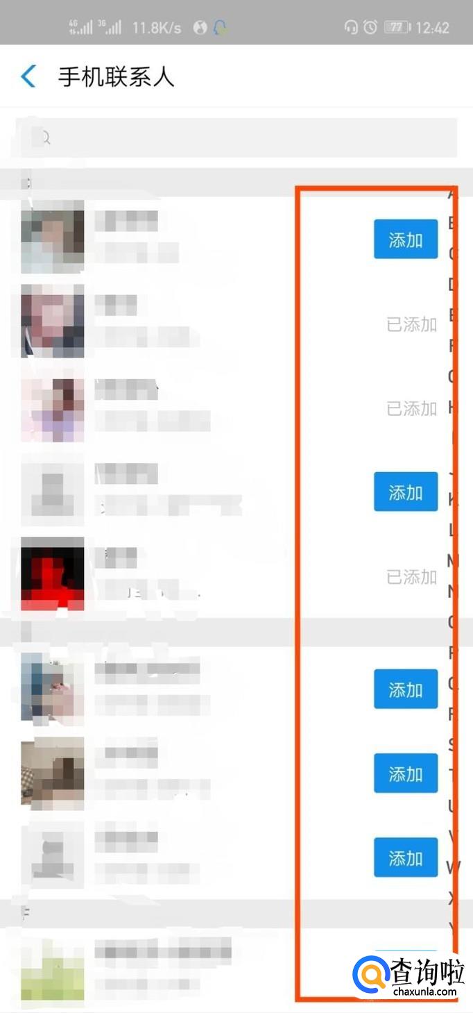在添加好友界面,找到“手机联系人”,点击进入,就会出现手机系统的好友,显示了“添加”的联系人就是可以添加为支付宝好友的人,点击“添加”即可。