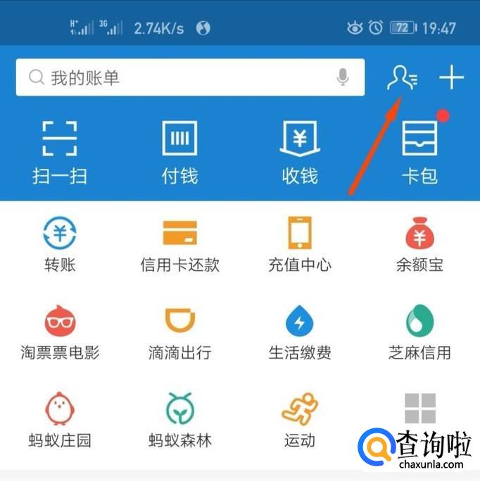 进入支付宝首页,点击右上角的好有图标,进入好友通讯录界面。